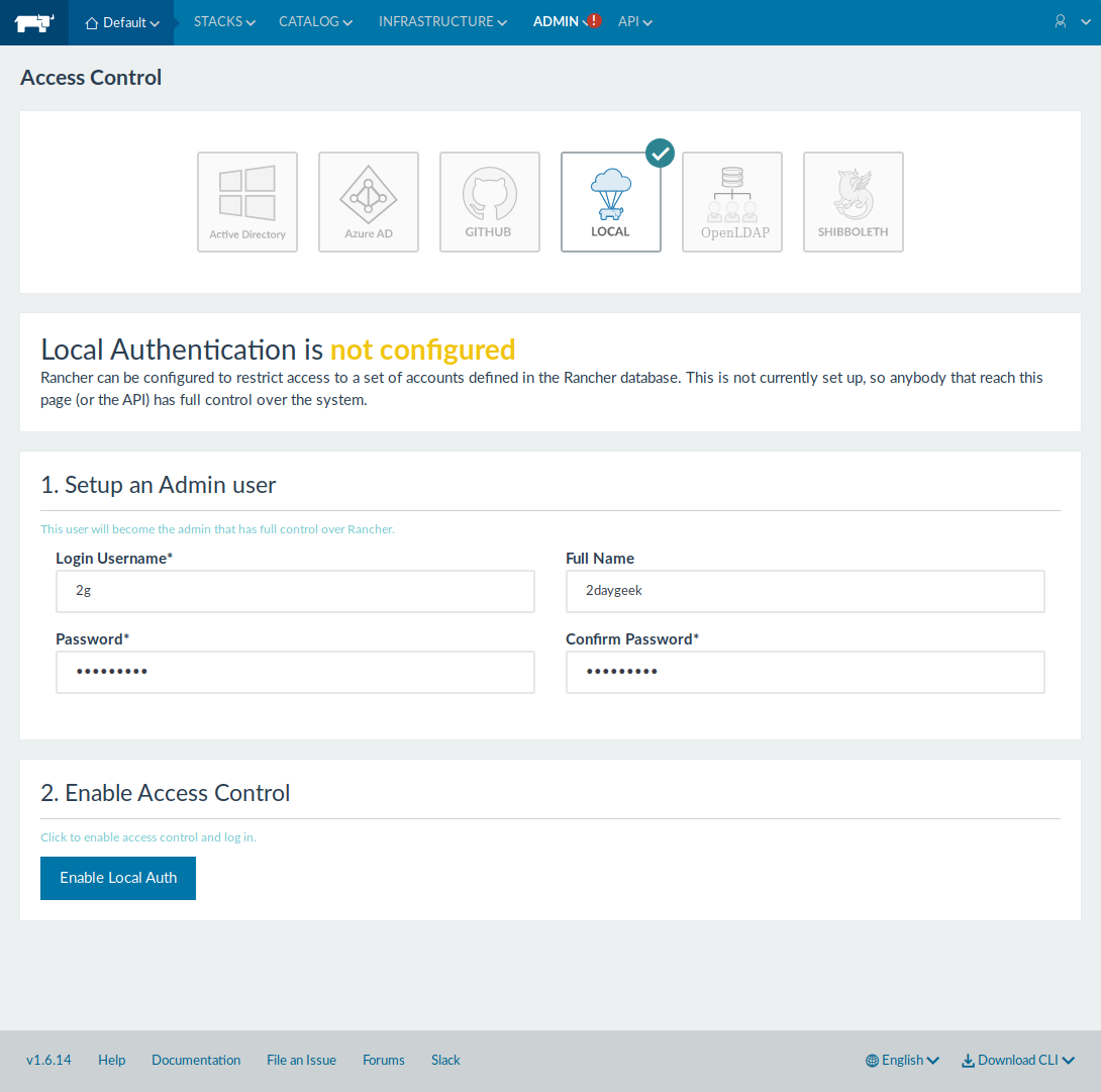 点击 “» Admin » Access Control”,输入下列的值最后点击 “Enable Authentication” 按钮去打开它。在我这里,是通过 “local authentication” 的方式打开的。