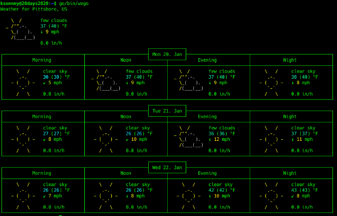 Wego 是用 Go 编写的程序,可以获取并显示你的当地天气。如果你愿意,它甚至可以用闪亮的 ASCII 艺术效果进行渲染。