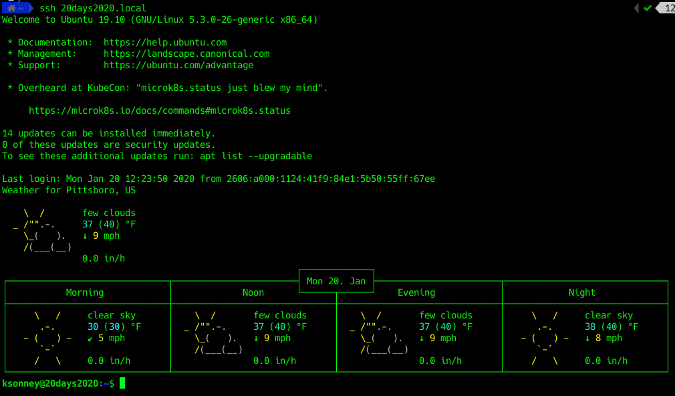 wttr.in 项目是 wego 上的基于 Web 的封装。它提供了一些其他显示选项,并且可以在同名网站上看到。关于 wttr.in 的一件很酷的事情是,你可以使用 curl 获取一行天气信息。我有一个名为 get_wttr 的 shell 函数,用于获取当前简化的预报信息。