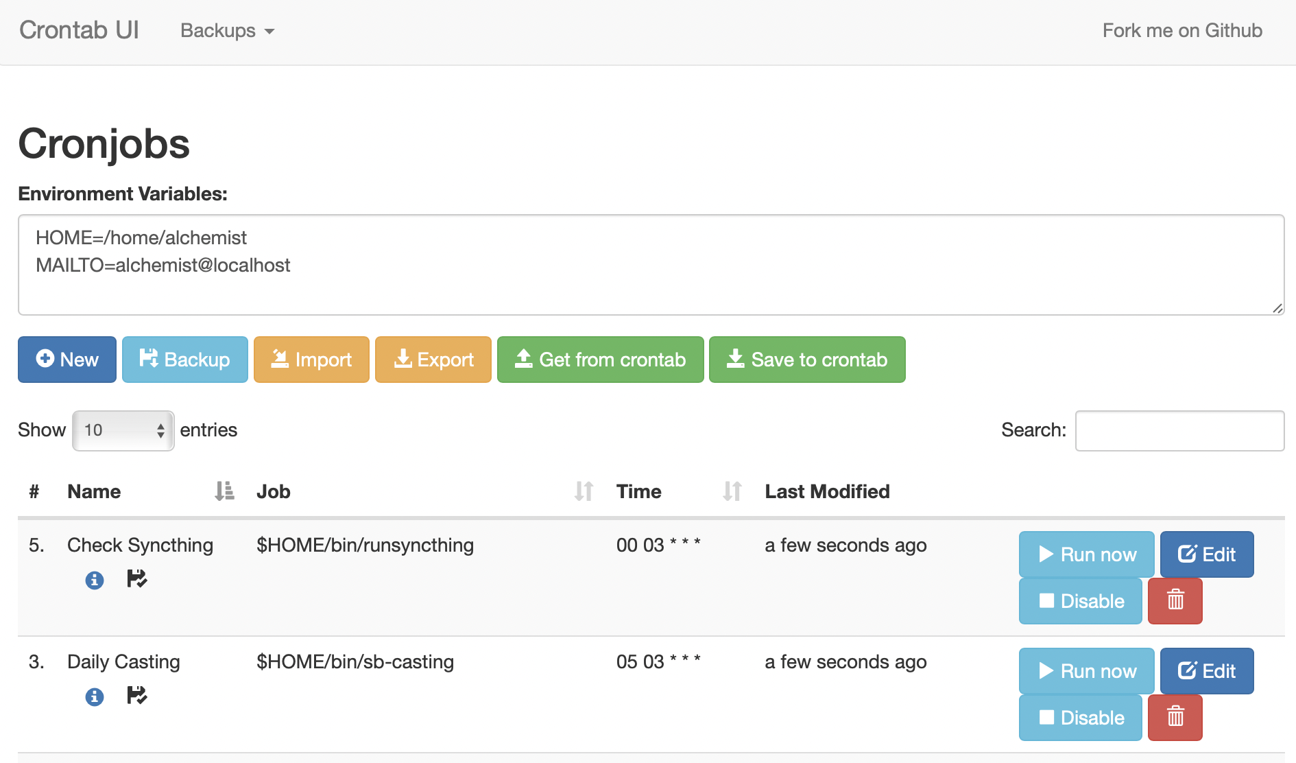 完成这些后,只需将你的网页浏览器指向 http://localhost:8000,你就会看到 crontab-ui 的网页界面。要做的第一件事是点击 “ 从 Crontab 获取 Get from Crontab ”,加载你可能有的任何现有作业。然后点击“ 备份 Backup ”,这样你就可以回滚你所做的任何修改。