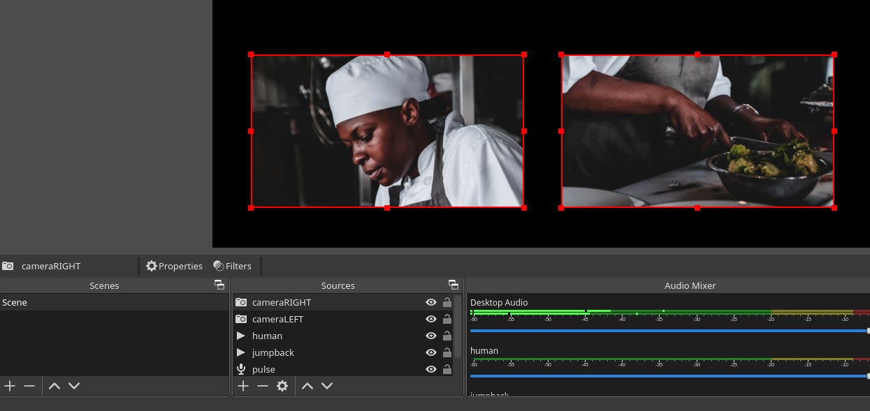 假设你有两个 USB 摄像头:一个在电脑左侧,另一个在右侧。左侧摄像头拍摄近景,右侧摄像头拍摄远景,并且在直播过程中你需要切换两个摄像头。在 OBS 中,你将每个摄像头添加到 源 Sources 面板中,并直观地将它们命名为 “camLEFT” 和 “camRIGHT”。