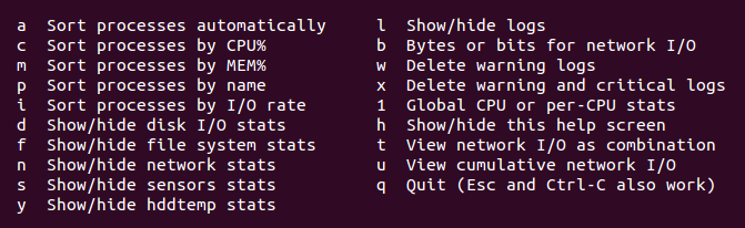 除了命令行选项,glances提供许多帮助选项,你可以当glances正在运行的时候使用,这是选项列表: