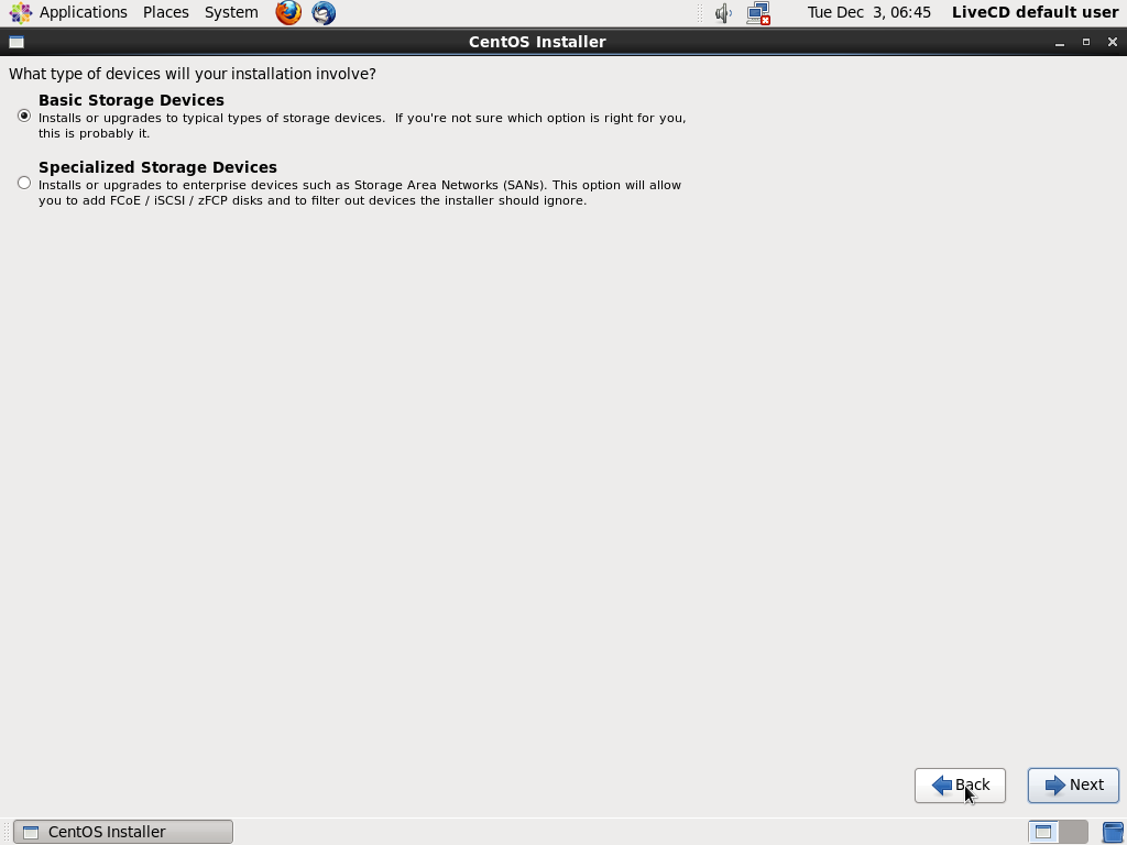5.存储类型完成键盘布局的选择,接下来的是选择用来安装CentOS的存储类型。对于本地硬盘启动,应该选择Basic storage。