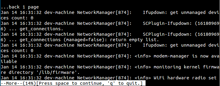 如果你的日志文件非常大,那么在其中查找你想要的字符串并不是那么容易。more命令的查找功能可以帮你,通过参数**+/string可以用来搜索字符串,找到的关键字会显示在第一行。比如我们要在/var/logs/syslog**文件中搜索“dhclient”,那more命令的格式: