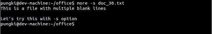 通过参数**-c**,more命令不会滚动页面,而是直接清除之前的内容,替换为下一页的内容。 With -c option, more will not scroll the page. It will clear the previous page and put the next page or lines there.