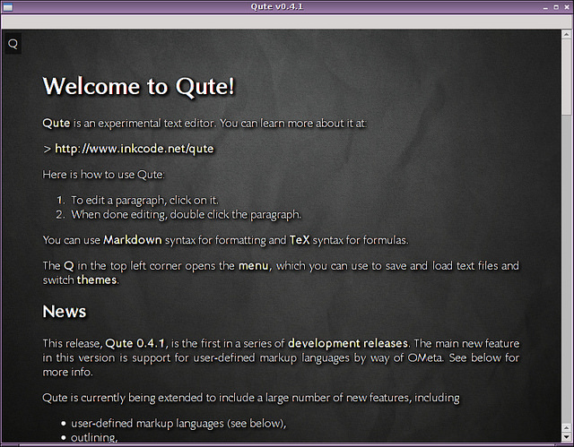 如果你想要一款更顺眼一点的编辑器,你可以试试我的最爱:Qute。没有酷炫的特性,也许有一点LaTeX排版使它开起来更美观,但是重点其实是在它的界面的。它提供了一个舒适的导航和编辑体验。如果你对终端感觉不太舒服,Qute是个不错的选择。