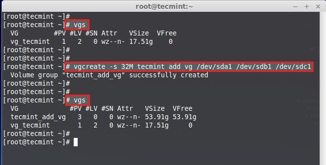 # vgcreate -s 32M tecmint_add_vg /dev/sda1 /dev/sdb1 /dev/sdc1