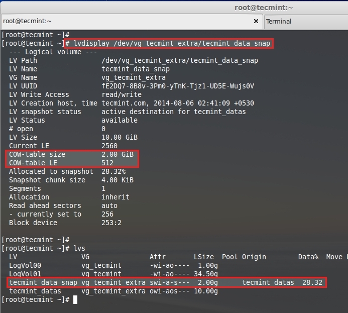 - 写时复制表大小,Cow = copy on Write,这是说对tecmint_data卷所作的任何改变都会写入此快照。