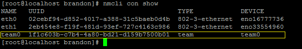 # nmcli con add type team-slave con-name team0-port2 ifname eno33554960 master team0