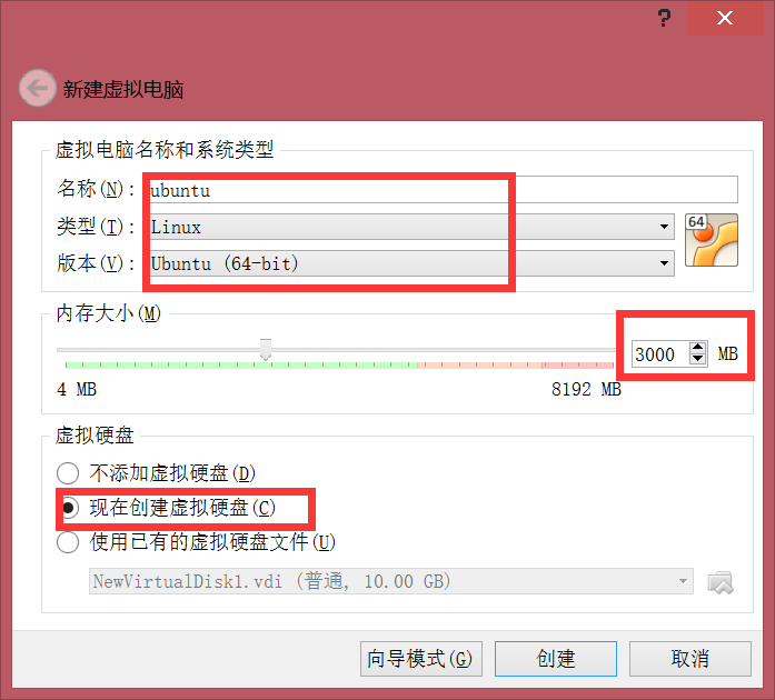 点击新建后会出来如下图所示的界面,一般如图填写即可,内存可酌情填写