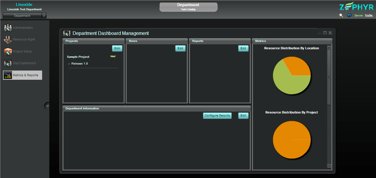 完成管理设置后保存设置,资源管理和项目配置也类似,然后开始使用 Zephyr 作为你的测试管理工具吧。如图所示在 Department Dashboard Management 中检查和编辑管理设置状态。