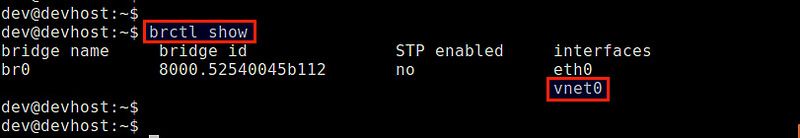 同样,使用如下命令确认你的虚拟机的虚拟网卡已经被成功的添加到了你先前创建的 br0 网桥中。