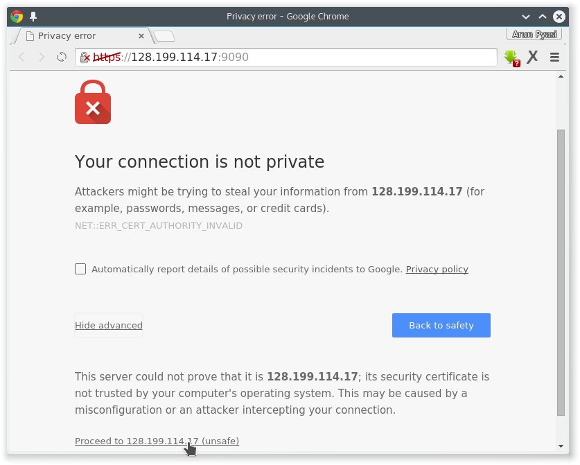 此时会出现一个 SSL 认证警告,因为我们正在使用一个自签名认证。我们只需要忽略这个警告并进入到登录页面,在 chrome/chromium 中,我们需要点击 Show Advanced 然后点击 Proceed to 128.199.114.17 (unsafe)。