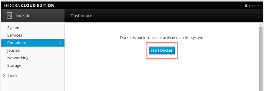 我们甚至可以用 Cockpit 管理 docker 容器。用 Cockpit 监控和管理 Docker 容器非常简单。由于我们的服务器中没有安装运行 docker,我们需要点击 Start Docker。
