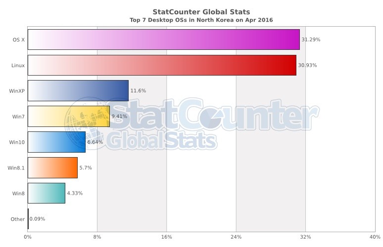 我们前两天提到过,Windows 的桌面市场份额已经跌破了90%,不过,也许你也听说了,在朝鲜国,Windows 的份额只能排名第三:第一名是 Mac 的 OS X,31.29%;第二名是 Linux,份额基本相当, 30.93%;第三名以及往后才是各种 Windows。等等,不要着急,如果你将这些各个版本的 Windows 份额加起来,其实发现,Windows 家族还是第一,达到 37.68%!当然,即便如此,Linux 也不错了,能有1/3的份额呢。