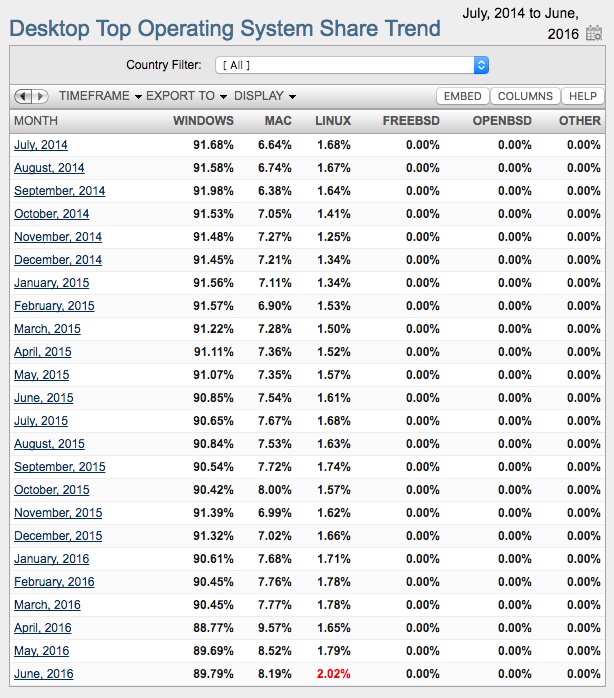 据市场调研机构的数据,在刚刚过去的六月份,Linux 桌面的全球市场份额突破了 2%——如果笔者没有记错的话,这是有史以来第一次达到 2%。