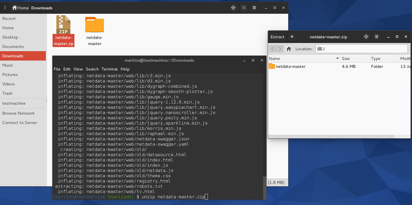 一种方法是下载 ZIP 文件。它包含仓库里的所有东西。但是如果仓库更新了,你需要重新下载 ZIP 文件。下载完 ZIP 文件后,你要用 unzip 命令行工具来解压文件。运行下面的命令能把 ZIP 文件的内容解压到 netdata 文件夹。