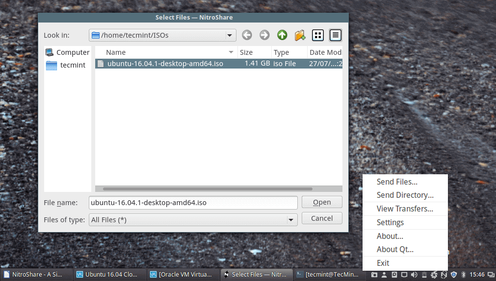 在成功安装后,在系统 dash 面板里或系统菜单里搜索 NitroShare,然后启动。NitroShare 非常容易使用,你可从该应用或托盘图标上找到“发送文件”、“发送目录”、“查看传输”等选项。