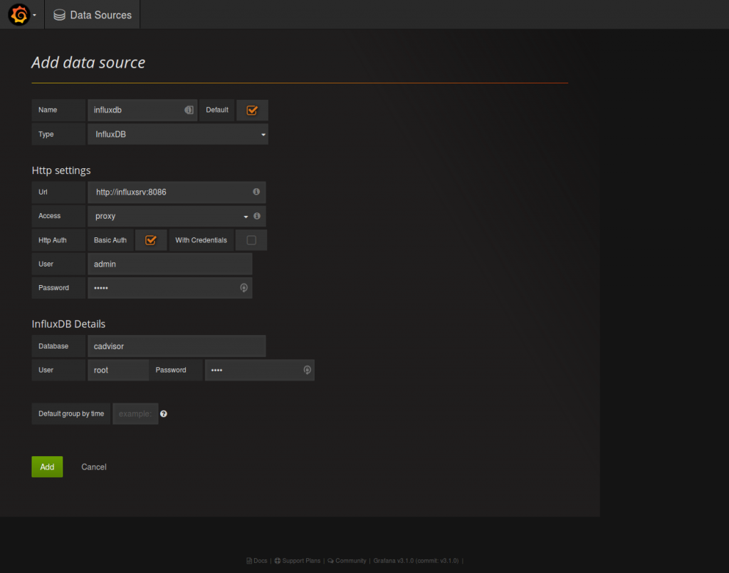 root@ubuntu:~# docker run -d -p 3000:3000 -e INFLUXDB_HOST=localhost -e INFLUXDB_PORT=8086 -e INFLUXDB_NAME=cadvisor -e INFLUXDB_USER=root -e INFLUXDB_PASS=root --link influxsrv:influxsrv --name grafana grafana/grafana
