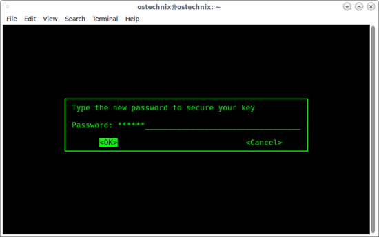 生成密钥文件可能需要几分钟时间,这具体取决于系统的速度。然而,在完成后系统会要求你输入新密码以确保密钥的安全: